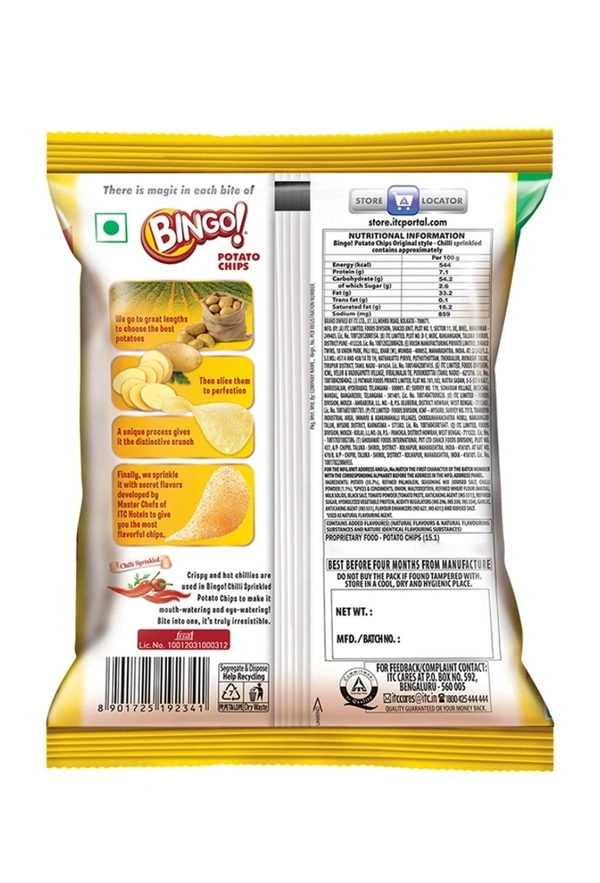 Serve Bingo! Chips Original Style Chilli Sprinkled at any time of the day. Mid-day hunger cravings, movie night, or a small house party, Bingo! Chilli Sprinkled is the best way to munch on something light and scrumptious. Enjoy a tasty cold beverage such as cold drinks, fruit juices, or even an iced tea with these spicy potato chips.